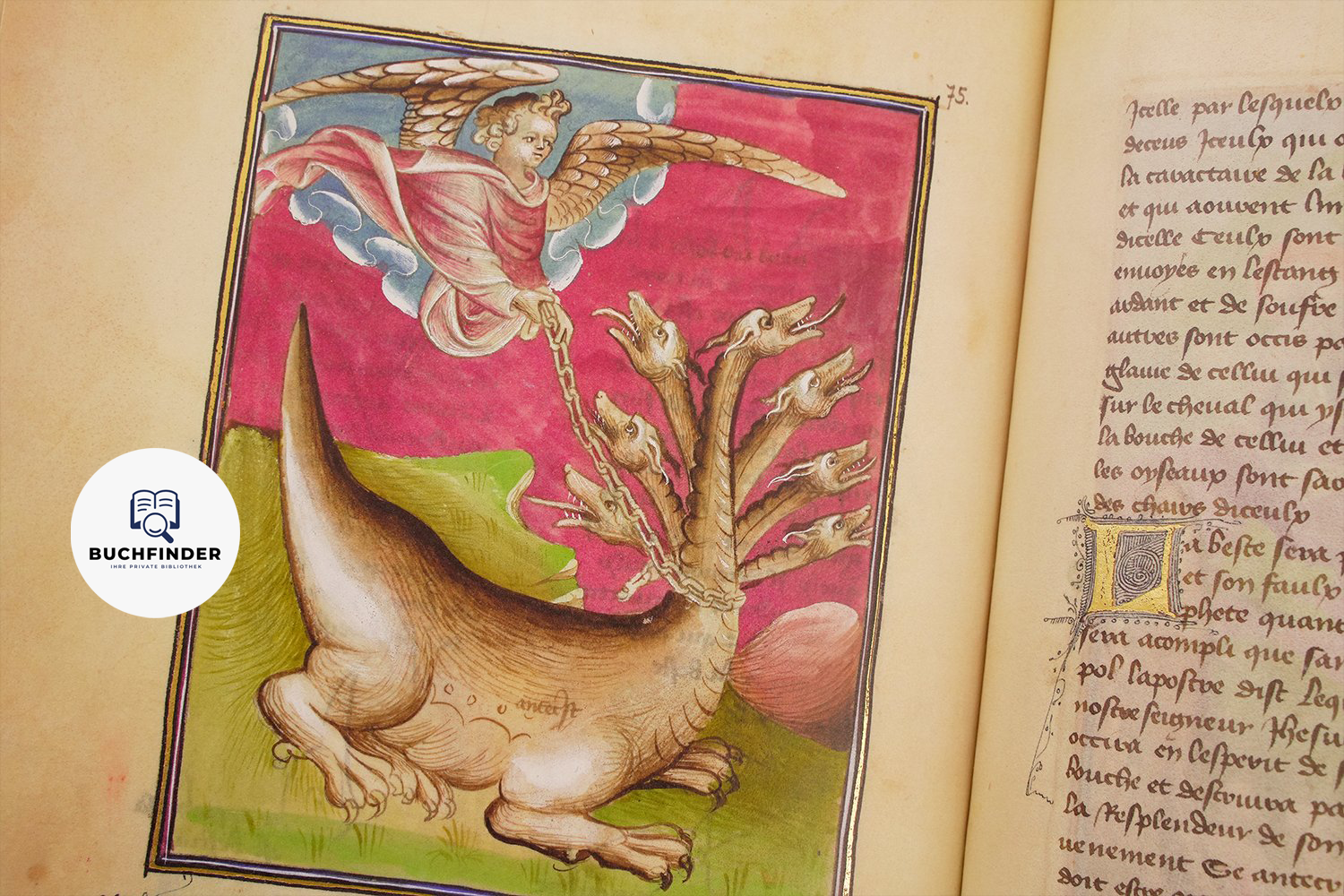 Dieses Meisterwerk der Pariser Buchkunst des frühen 15. Jahrhunderts stammt aus der Hand des sogenannten Meisters der Berry-Apokalypse. Sein Illuminationsstil war einzigartig unter den Zeitgenossen und zeichnet sich unter anderem durch einen zurückhaltenden, aber gekonnten Einsatz von Farbe und Schattierung sowie die Konzentration auf das Geschehen im Vordergrund aus. Die Berry-Apokalypse wurde wahrscheinlich um 1410 von dem berühmten bibliophilen Herzog Jean de Berry in Auftrag gegeben und ging durch die Hände verschiedener Sammler, bevor sie ihren endgültigen Aufbewahrungsort in der berühmten Morgan Library in New York fand. 85 große Miniaturen schmücken den Text, der aus Auszügen der Offenbarung und einem Kommentar des Benediktinermönchs Berengaudus besteht.