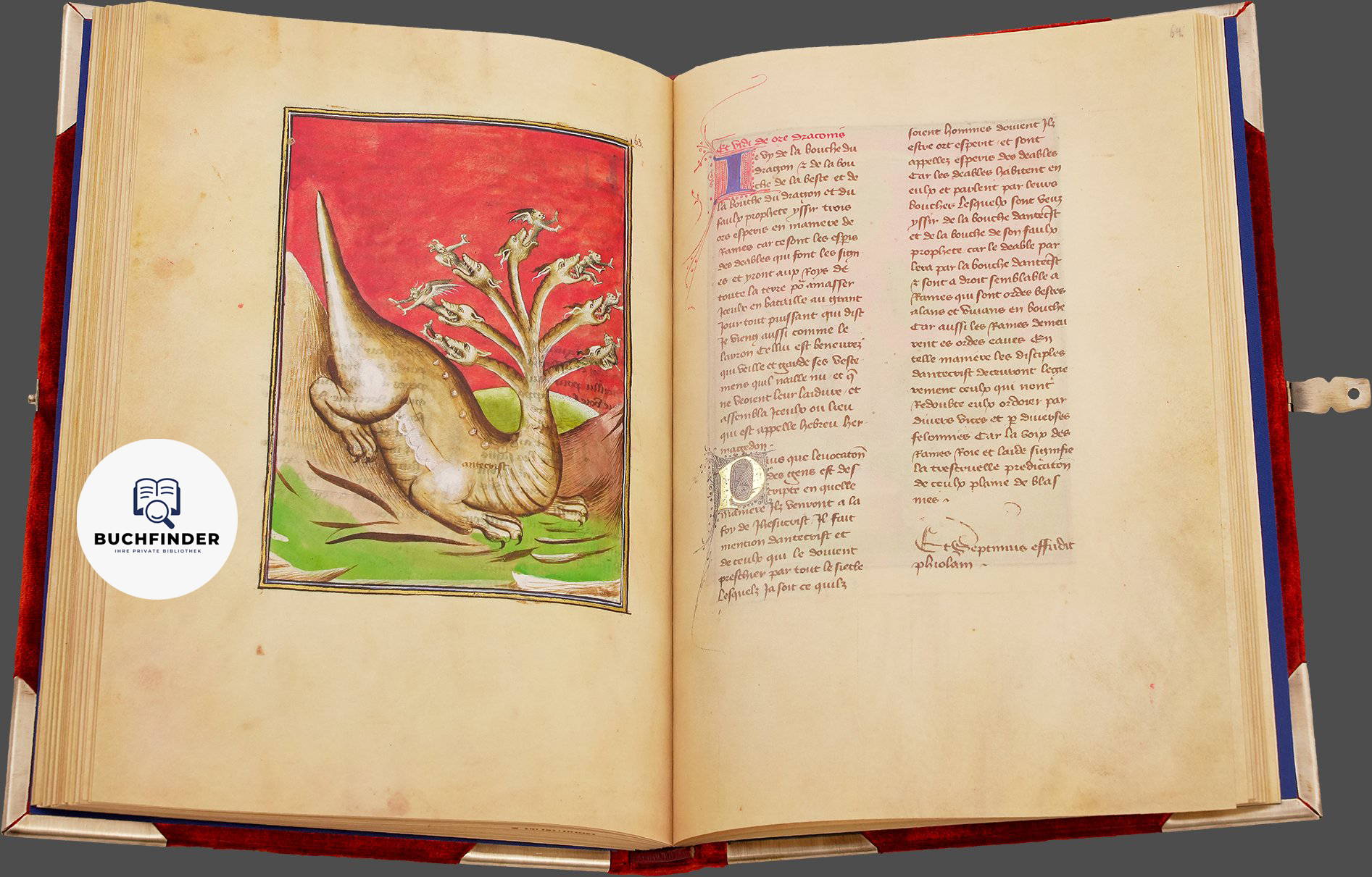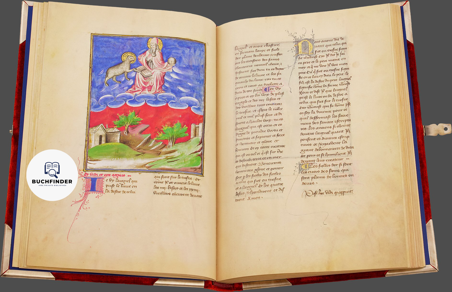 Diese prächtige Apokalypse-Handschrift, die um 1410 in Paris für den berühmten Bibliophilen Duc Jean de Berry (1340-1416) angefertigt wurde, enthält Auszüge aus dem Text der Offenbarung sowie einen Kommentar des Benediktinermönchs Berengaudus (840-892), der von 85 halb- oder ganzseitigen Miniaturen geschmückt wird. Der Text ist in zwei Spalten von einer kundigen Hand in Bastarda-Schrift und mit eleganten rot-blauen Initialen geschrieben. Die Farbpalette der Miniaturen wird von Rot, Blau und Grün dominiert, oft mit monochromen Hintergründen. Blattgold wurde für Heiligenscheine, Kronen und einige Initialen verwendet. Stilistisch einzigartig und klar auf Charaktere und Ereignisse fokussiert, besitzen die Miniaturen eine faszinierende Ausdruckskraft, eine dramatische Ikonographie und einen expliziten Bezug zum Text. Zugleich weisen sie eine traumhafte Qualität mit kunstvoller Vegetation und realistischer Architektur auf. All dies fügt sich zu einem künstlerisch einzigartigen Manuskript der Apokalypse-Tradition zusammen.