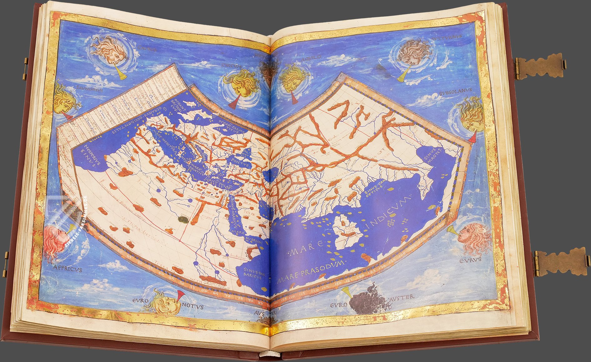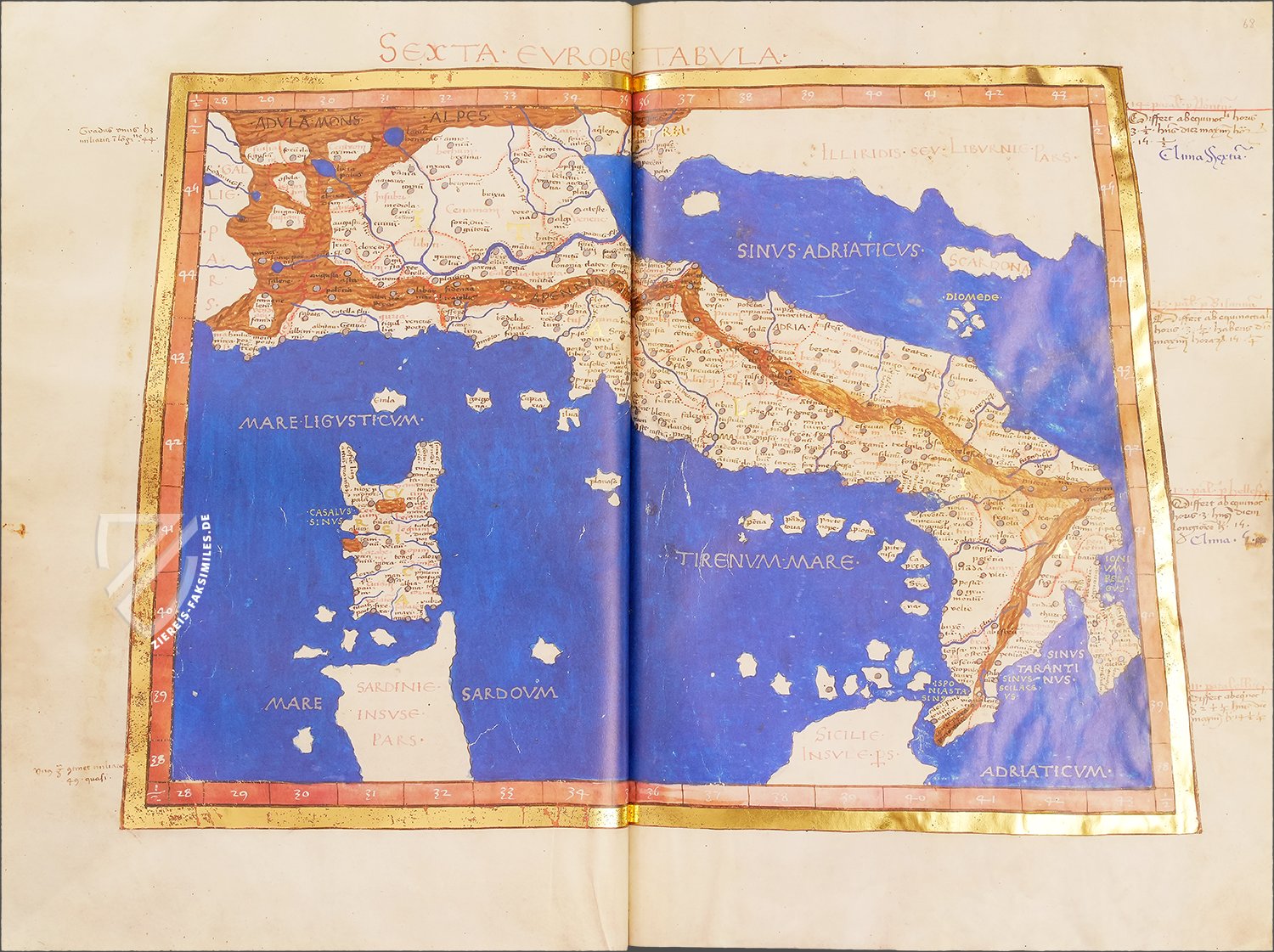 Der große Universalgelehrte Claudius Ptolemäus verfasste im zweiten Jahrhundert ein Traktat über die Geographie, welches bis ins Hochmittelalter nicht an Bedeutung verlor. Anhand dieses Traktats entstanden weltweit die ersten Landkarten und Atlanten. Der hier vorliegende Atlas ist eine der schönsten Bearbeitungen der Lehre des Ptolemäus. Er entstand im 15. Jahrhundert in Italien, als Auftragswerk König Alfons´ V. von Aragon. Das kostbare Werk ist mit leuchtend farbigen Landkarten und zahlreichen Verzierungen aus edlem Blattgold geschmückt.